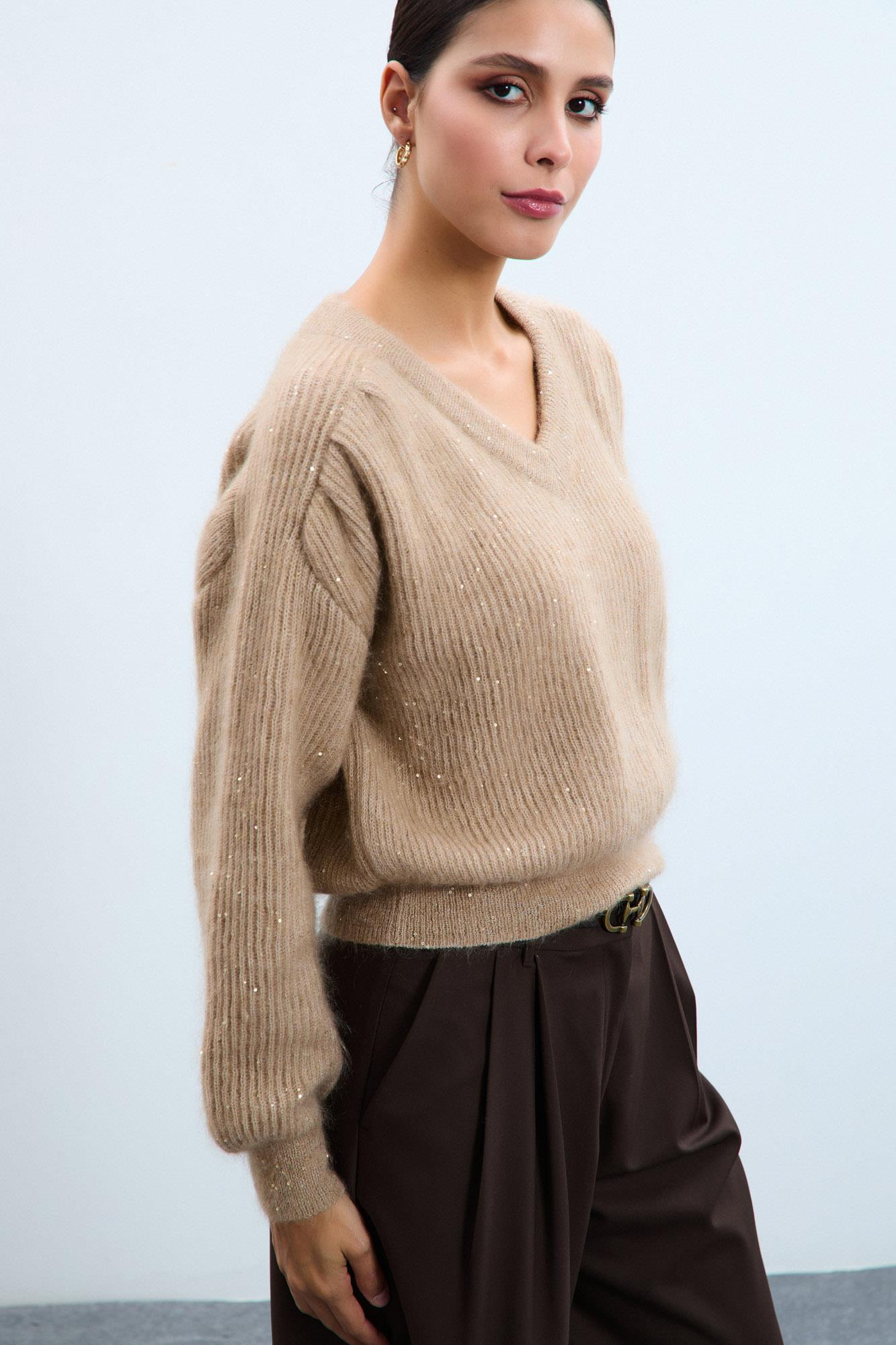Mohair and Wool Blend Draped Shoulder Sequin Sweater KZK10388BEJ Mohair and Wool Blend Draped Shoulder Sequin Sweater KZK10388KEMİK Mohair and Wool Blend Draped Shoulder Sequin Sweater KZK10388PUDRA Mohair and Wool Blend Draped Shoulder Sequin Sweater KZK10388SIYAH Mohair and Wool Blend Draped Shoulder Sequin Sweater KZK10388GRİ