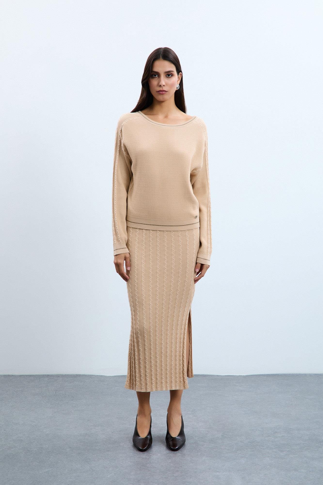 Organik Pamuk Karışımlı Örgü Oyunlu Midi Etek ETK10748 BEJ