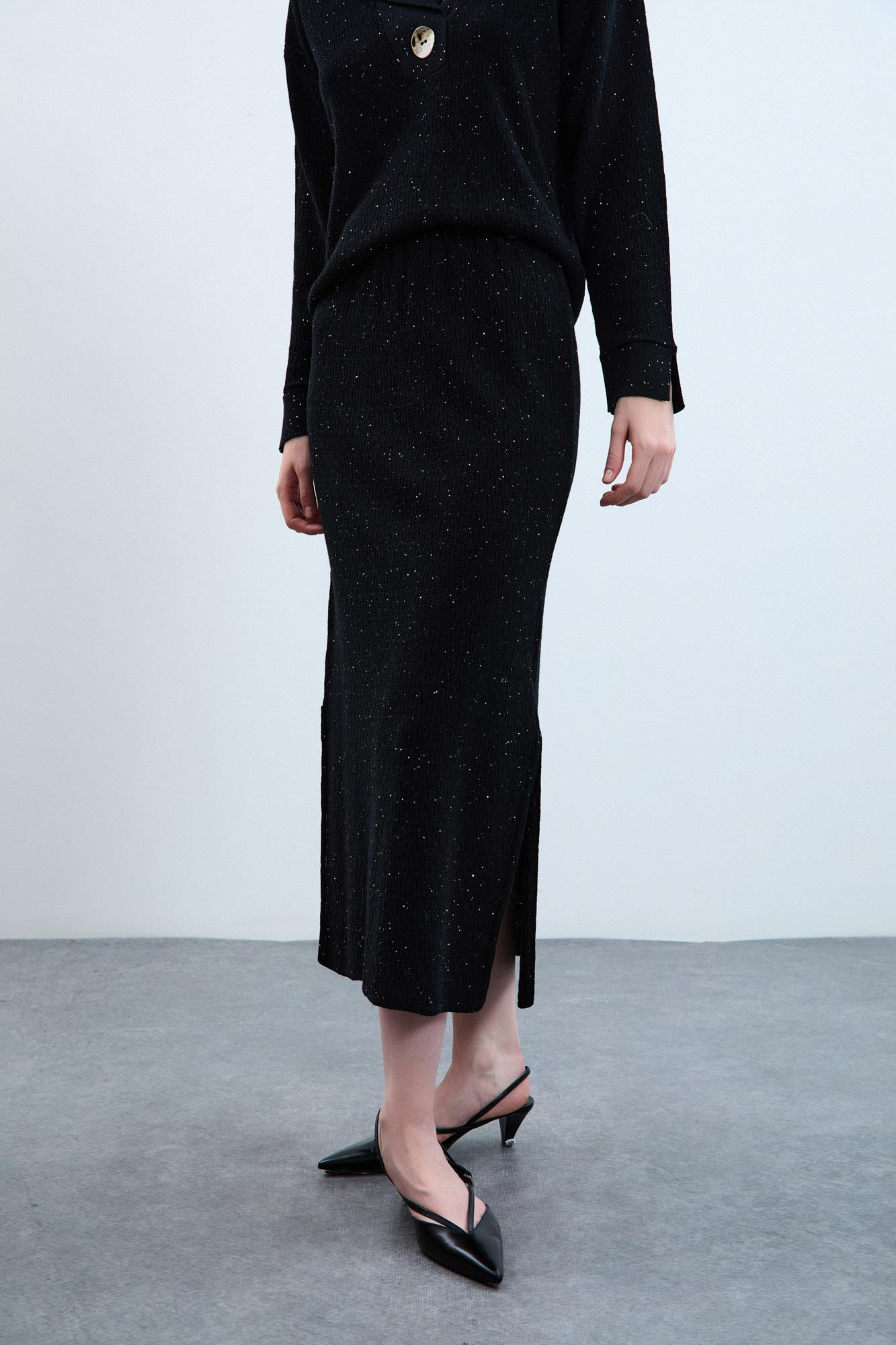Organik Pamuk Karışımlı Pullu Yırtmaçlı Midi Etek ETK10714SIYAH